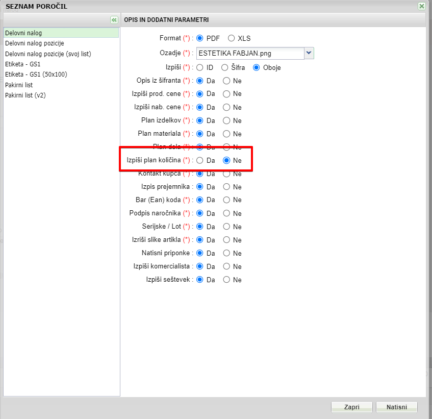 Pri izpisu delovnih nalogov smo dodali novo možnost, ki vam omogoča omejitve izpisa planirane količe pri Materialu in Delu.