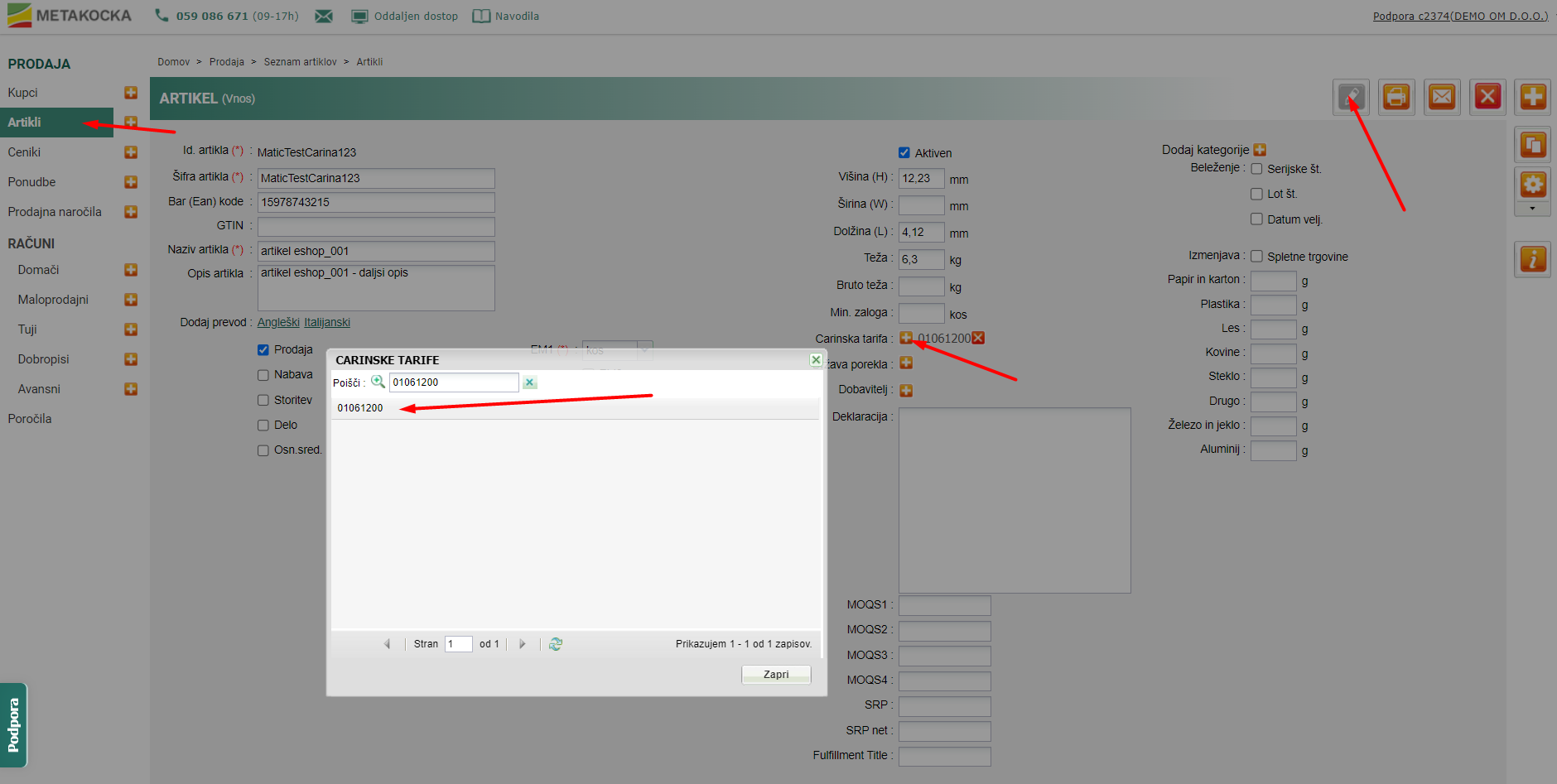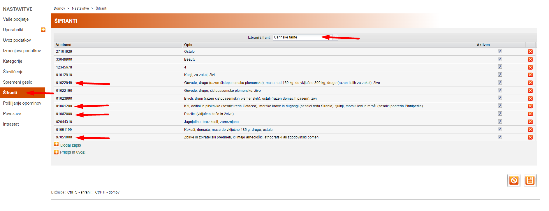 Ko boste artiklu dodali carinsko tarifo, se bo avtomatsko kreirala potem tudi v šifrantih – carinske tarife, kar je lepo vidno spodaj.