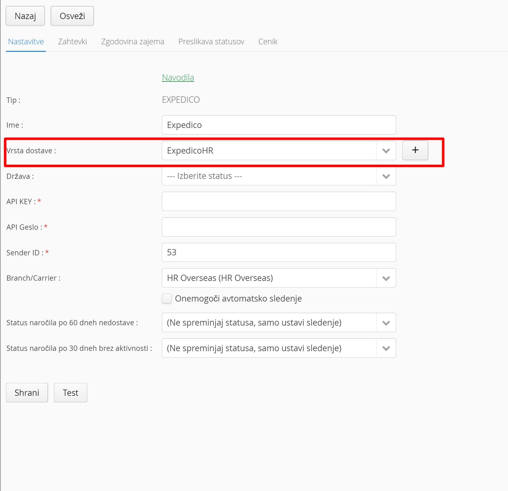 Sedaj to lahko vrsto dostave uredite že pri dodajanju same integracije dostavne službe: