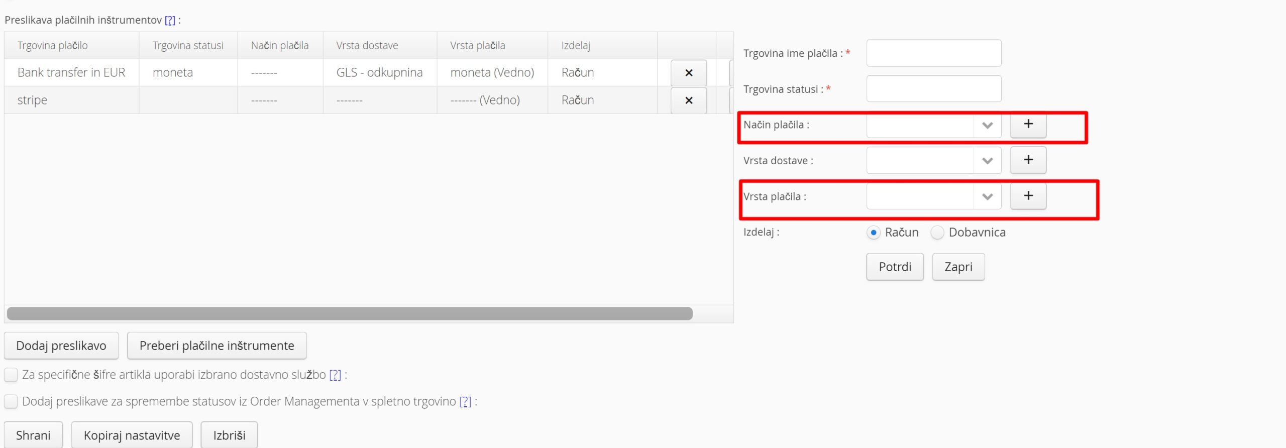 In dodajanje vrsto/način pačila že kar pri sami preslikavi plačil spletne trgovine: