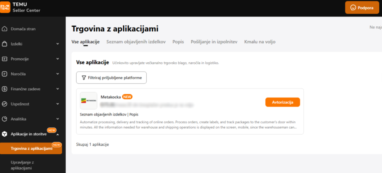Na Temuju med aplikacijami poiščite Metakocko in ustvarite povezavo med vašim prodajnim profilom in Metakocko. Pridobili boste API token, ki ga nato vnesete v Metakocko.