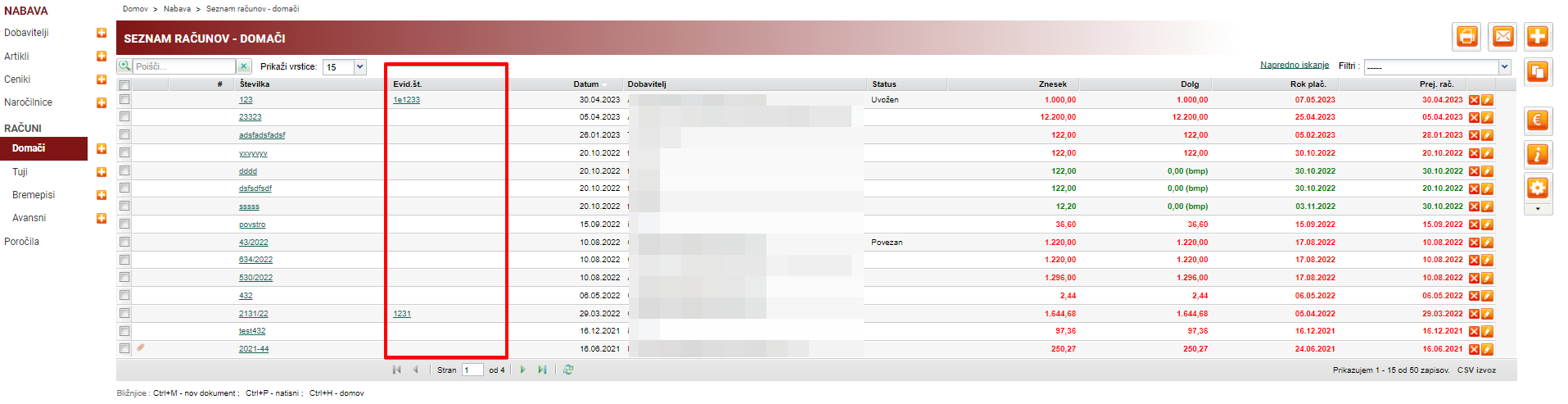 Pri pregledu nabavnih računov smo nadgradili prikaz, dodali smo dodatni stolpec Evidenčna številka