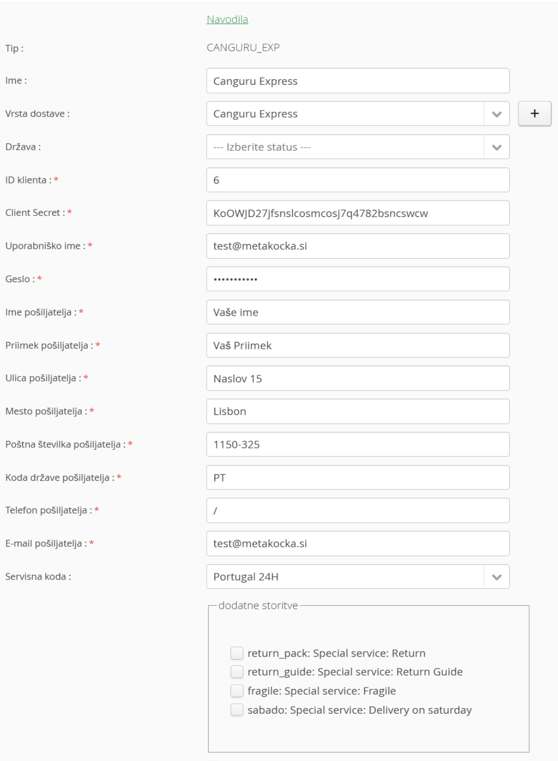 Dostavna služba Canguru Express skrbi za dostavo na Portugalskem. V  Dodatnih nastavitvah jo najdete pod oznako Canguru Express,  kjer vpišete zahtevane podatke in nato povezavo lahko uporabljate: