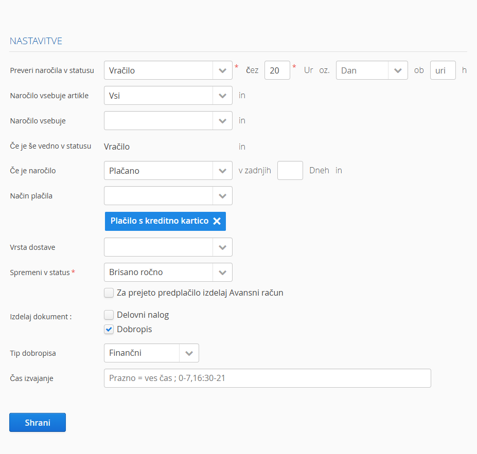 Na voljo nastavitev, ki omogoča, da se iz izbranega statusa avtomatsko kreirajo dobropisi. V dodatnih nastavitvah / Obdelava naročil – avtomatika, lahko izbirate kateri tip dobropisa se bo kreiral: finančni ali blagovni dobropis.