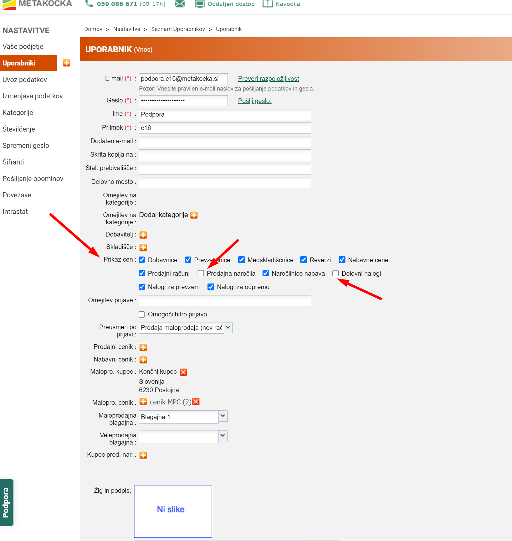 Če želite, lahko uporabniku zakrijete cene pri: Prodajni računi, prodajna naročila, naročilnica nabava, delovni nalogi, naročilnice, nalog za prevzem.