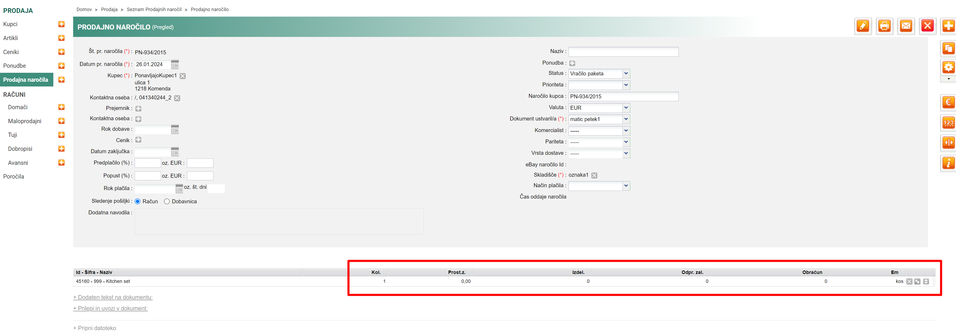 Sedaj če pogledamo prodajno naročilo in delovni nalog cene ne bodo vidne: