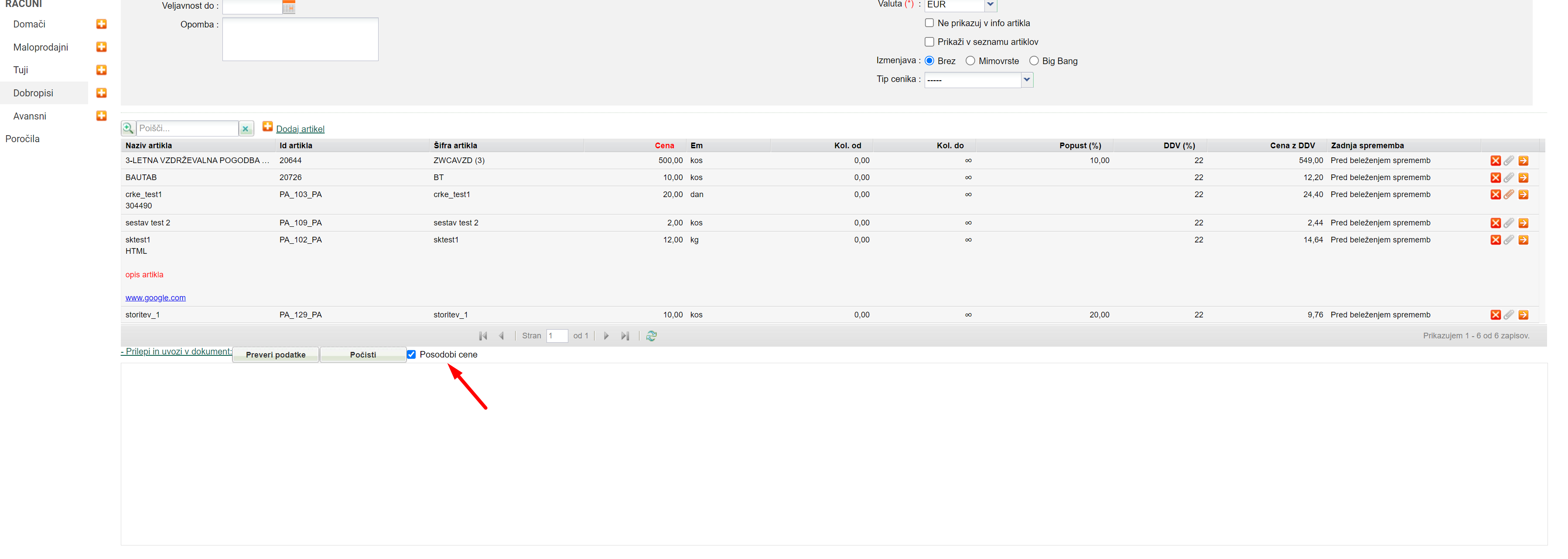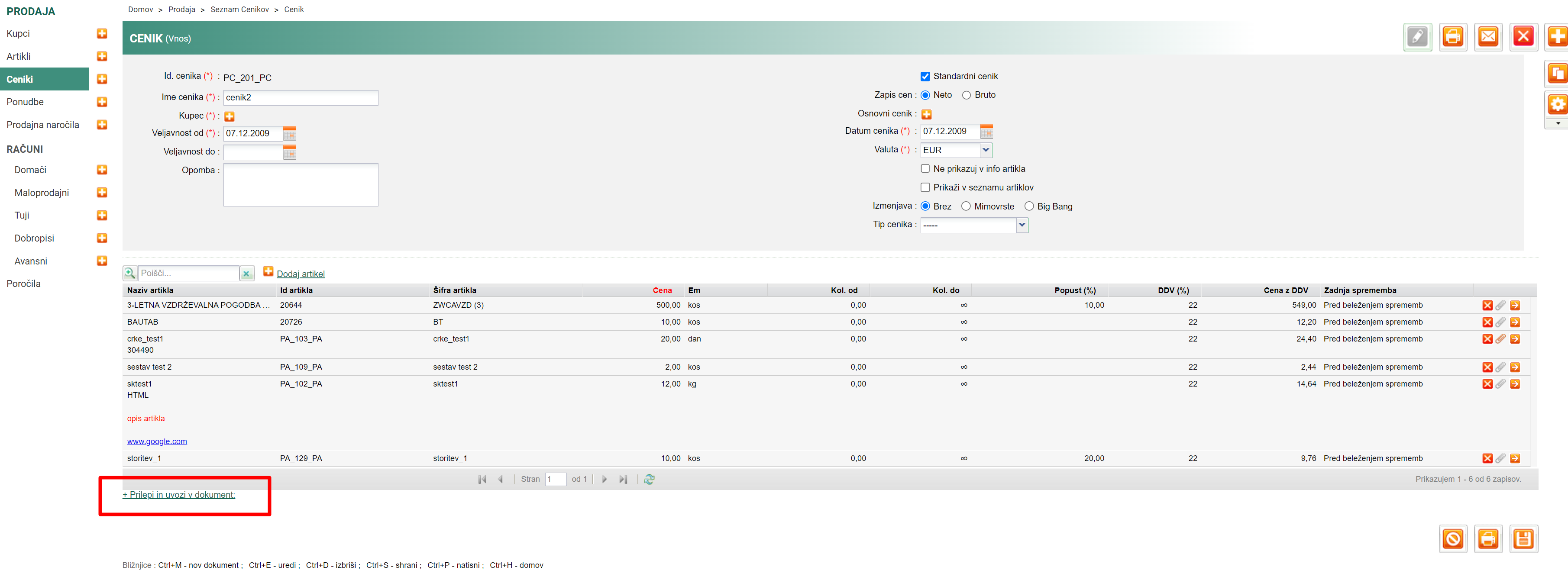 Omogočili smo novo funkcijo spreminjanja/dodajanja cen in artiklov na cenike. V dokumentu boste videli možnost ”Prilepi in uvozi v dokument”.