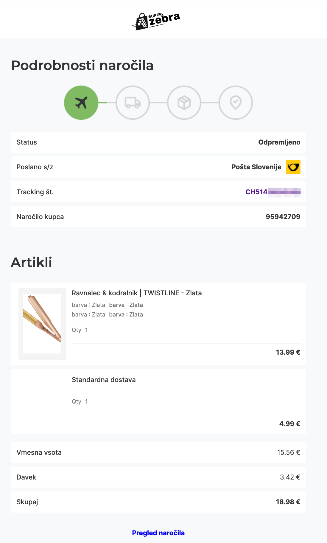 Predstavljamo novo funkcionalnost Tracking page – prikaz sledenja pošiljk z elementi vaše podobe in vašim kupcem razumljivimi statusi, ki so predstavljeni tudi grafično. Ta funkcija za vsa odpremljena naročila omogoči, da kupcem preko email-a ali SMS-a s pošljete povezavo do te nove strani za pregled statusa naročila, na kateri vidijo razumljive informacije o pošiljki in kjer lahko dodate tudi povezave na druge aplikacije kot je npr Vračila.
