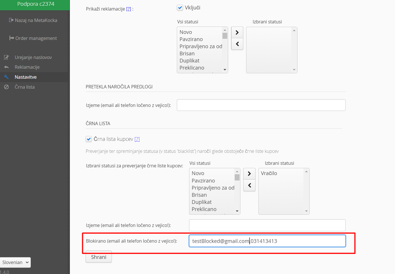 Kreirali smo dodatno nastavitev trde črne liste. Od navadne črne liste se razlikuje po zgodovini kupca, omogočena je uporabnikom modula Urejanje naslovov. Trda črna lista je lahko ustvarjena tudi za kupce z pozitivno zgodovino, kar pomeni da lahko prepreči nakupe od neželenega naročnika / kraji telefona / zlorabi e-maila. Ob kreiranju naročila z določenimi e-maili in telefonskimi številkami, se status spremeni v blacklist in onemogoči avtomatsko pošiljanje.