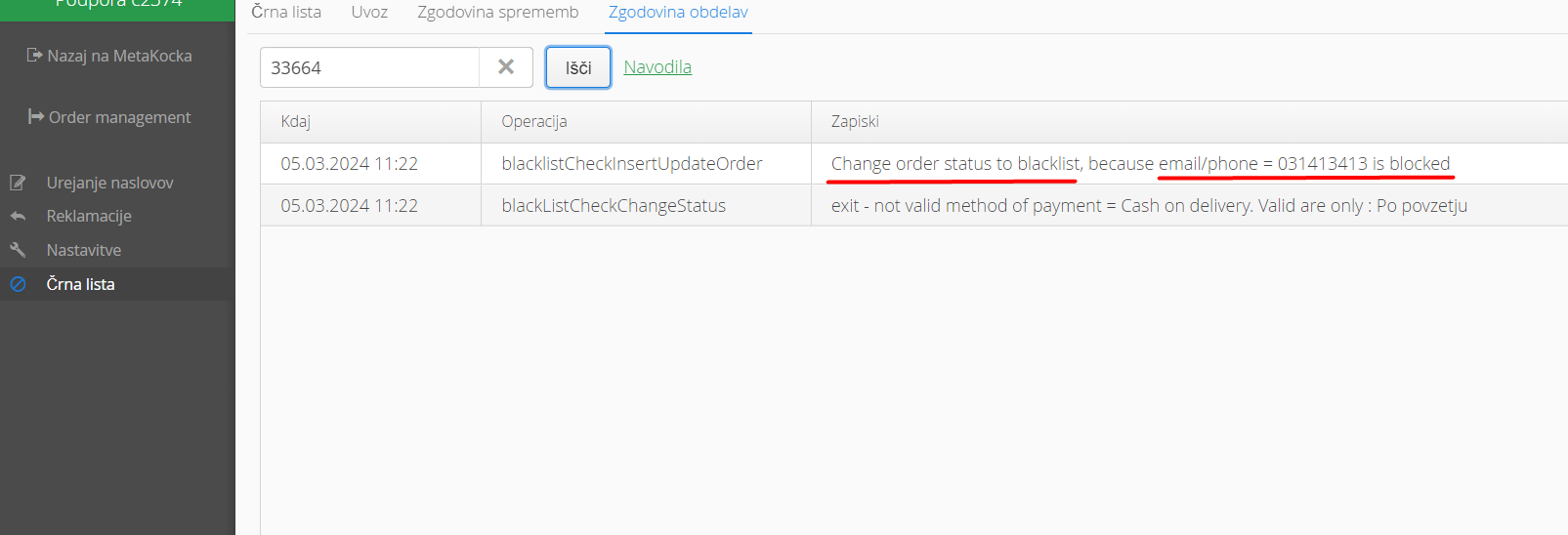 Pregled delovanja je možno preveriti v zgodovini obdelav z številom naročila, kot na primeru spodaj.